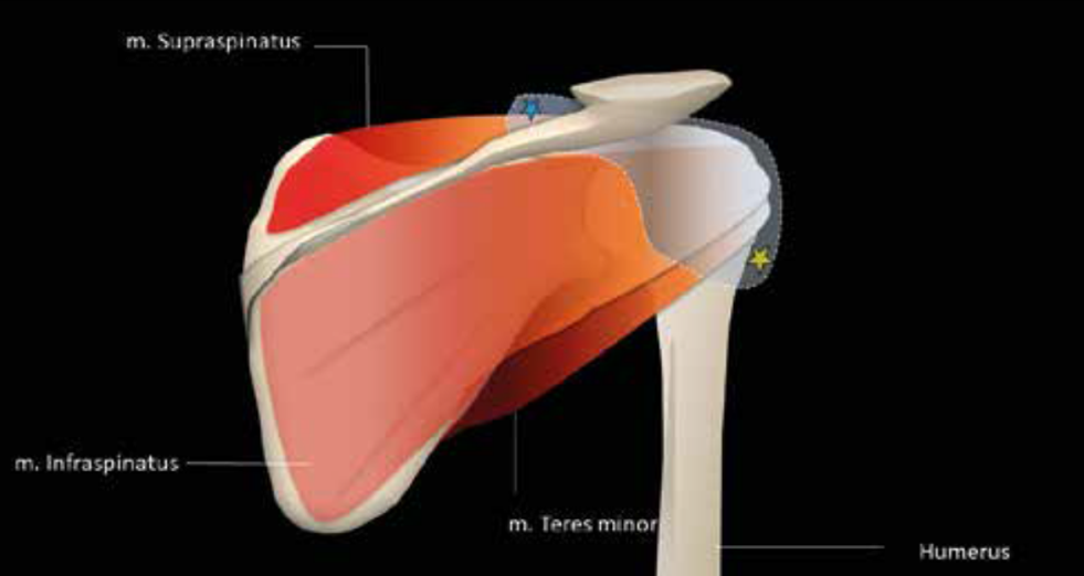 Figuur 2: schematische weergave van de achterzijde van het rechter schouderblad met rotator cuff). Het blauwe sterretje is de bursa subacromialis, de gele ster de bursa subdeltoidea.