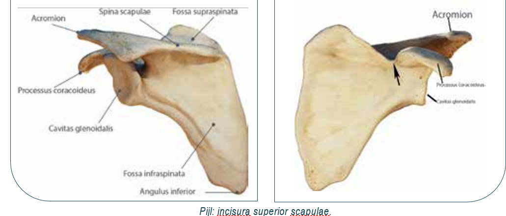 Afbeelding: Dorsaal (a) en ventraal (b) aanzicht van een linker scapula.