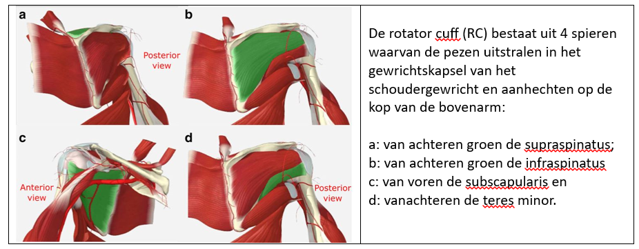 De rotator cuff bestaat uit vier pezen/spieren die zorgen voor de stabiliteit en beweging van het schoudergewricht, zie figuur onder.