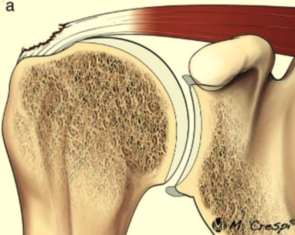 ![]() | In het figuur hiernaast is de pees van de supraspinatus te zien, een pees die bij RCRSP vaak aangemerkt kan worden als de bron voor de pijnklachten. De pees kan geïrriteerd en verdikt zijn. Vaak is sprake van enige beschadiging (zie figuur met partiele schade aan de buitenzijde) en soms is sprake van een ruptuur. Overigens treden die beschadigingen ook vanzelf op (bij 60-plussers heeft 40% van de mensen zonder schouderklachten een ruptuur) en ook met een beschadiging kan je schouder prima functioneren. |